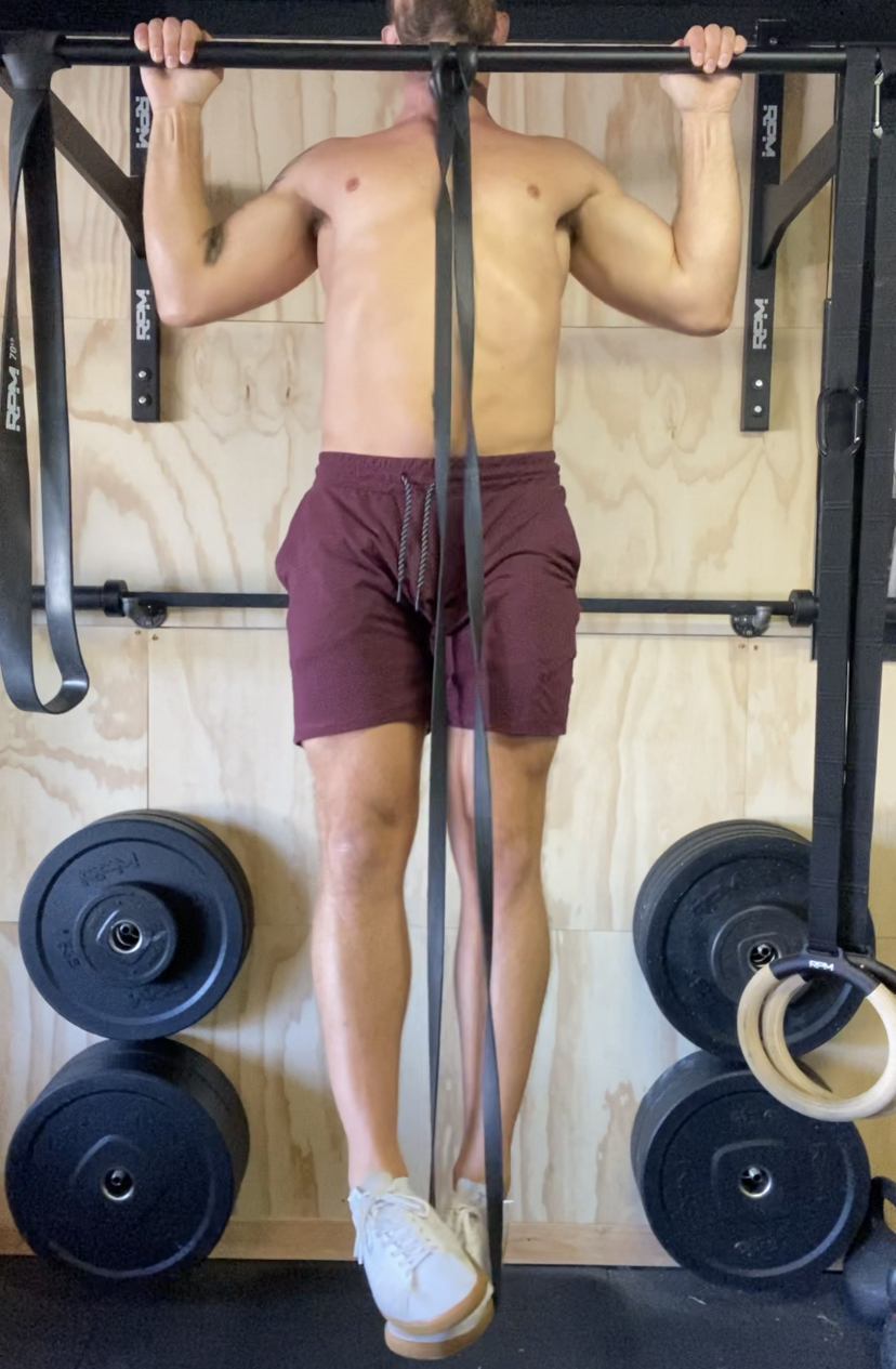 Secure a band over the pull-up bar. Put one foot in the band and then "trap" the band on the foot with your other foot. You don't want the band slipping off... trust me! Over time keep switching out the band to one with less assistance to make them more challenging.